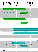 The above is a reduced example of the new BLAST graphical overview format. The graph's purpose is to give the user a brief summary of the entire result set that provides a broad perspective on the data. Significant features include: