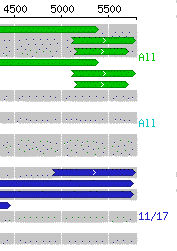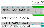 All HSPs for a displayed hit are drawn. They share a single background color to signify their relationship. Here are two hits, each containing multiple HSPs: